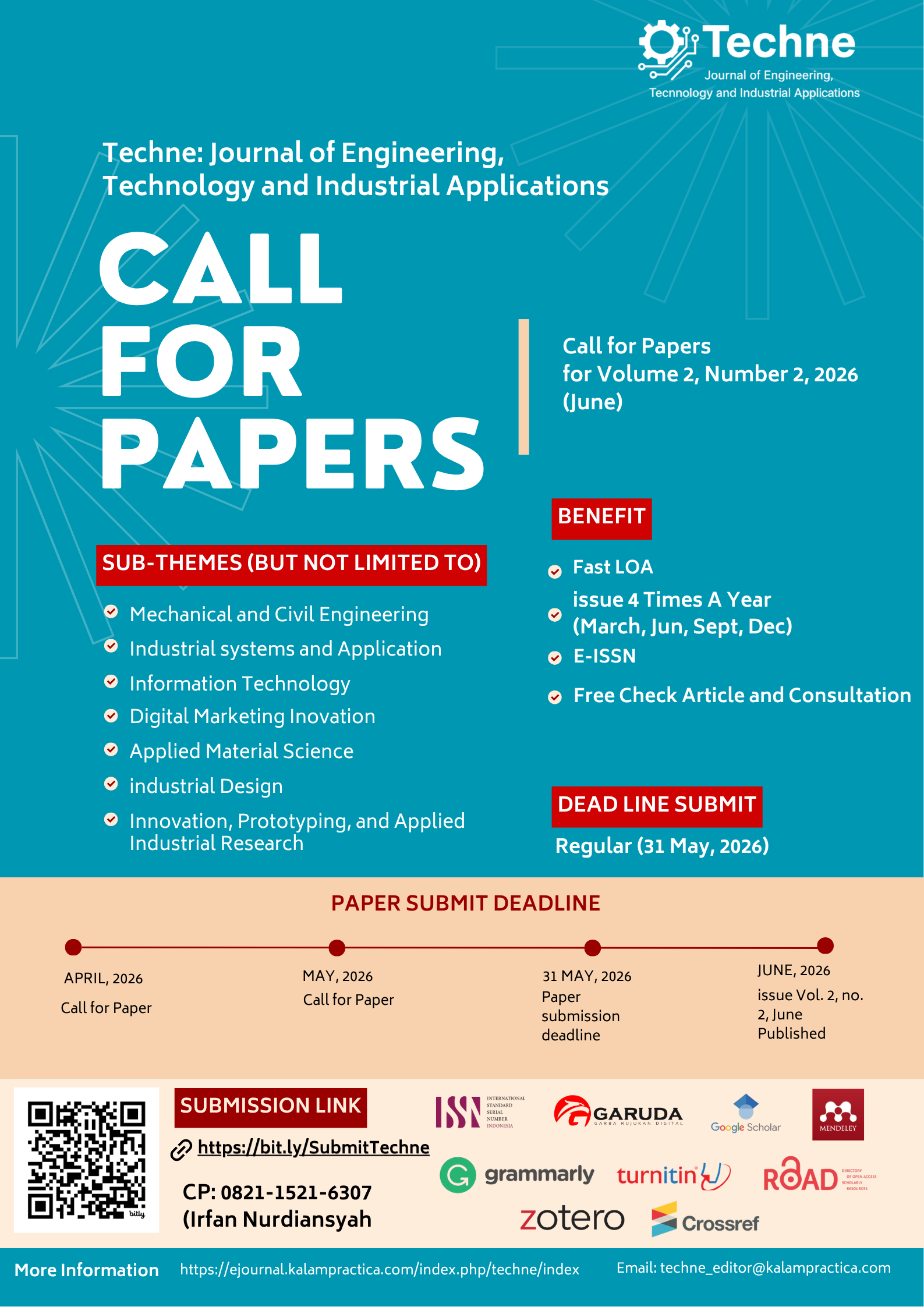 Techne: Journal of Engineering, Technology and Industrial Applications is a peer-reviewed open-access journal dedicated to advancing scholarly work in engineering, applied technology, and industrial innovation. Techne publishes high-quality empirical research, technical reports, experimental studies, design analyses, case studies, and emerging technology reviews that contribute to the development and application of engineering solutions.